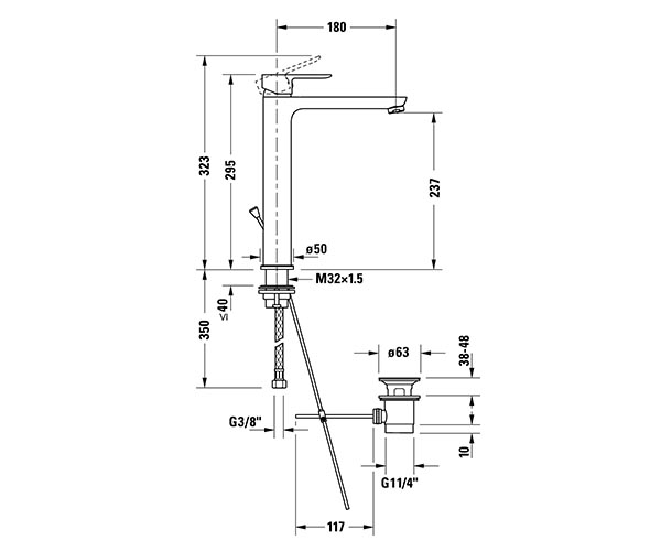陶瓷混合系统, 伸出长度 180 mm, 连接软管 3/8", 标准喷雾, 表面镀铬, 温度范围可调节, 推荐在压力 3-5 bar下进行操作, 带下水器套装, 295 mm